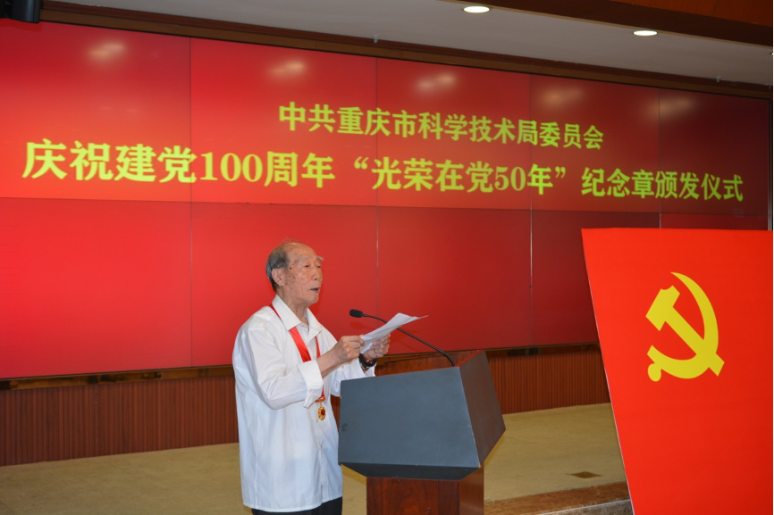 党龄63年的喻人龙同志作为老党员代表现场发言,他怀着激动的心情向大家分享了自己在党的领导下为科技事业开展奋斗的历程和感悟。仪式结束后在接受市电视台采访时表示:要活到老,学到老,为党为人民多作贡献,在新时代的长征路上,坚守初心如磐,老当益壮,再书使命!